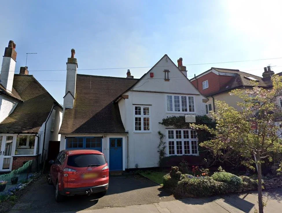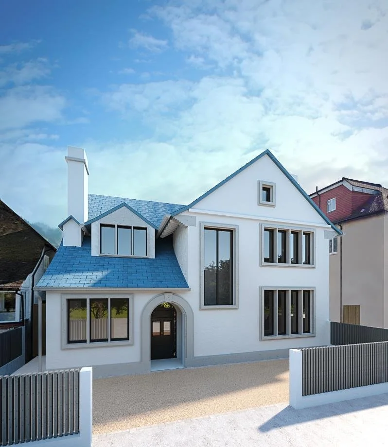 The design for the renovation of this house combines modern sleek lines with respect for the existing Tudor-style architecture. The walls are rendered in white plaster to give a sleek look, and symmetrical new windows and doors are installed to give a modern feel. Louvre cladding panels will enhance the modern contemporary looks.